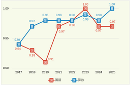図4は、全国(公立)平均を1として、全国学力・学習状況調査より作成した。なお、2018年度調査までは、国語・算数の各科目にA・B、2種類が出題されていたため、A・Bの問題数を考慮した加重平均で「対全国比」を算出している。