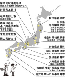 秋田県藤里町/岩手県束稲山麓地域(一関市舞川地区・奥州市生母地区・平泉町長島地区)/尾瀬流域連携地域(福島県南会津町・群馬県片品村)/群馬県上野村/神奈川県相模原市(緑区青根・牧野地域)/木曽川水系上下流連携地域(愛知県大府市・長野県木曽町)/岐阜県郡上市(石徹白地域)/京都府京都市/奈良県吉野町/岡山県新庄村 / 岡山県備中地域 ( 笠岡市・高梁市・総社市 ) /愛媛県松野町/大分県日田市(筑後川上流地域)/宮崎県椎葉・西米良地域(椎葉村・西米良村)/鹿児島県いちき串木野市