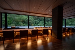 夜そして朝の食事は森そして湯川の流れを眺め、風や鳥のさえずりを聞きながら、オープンテラス付き個室ダイニングでゆったりと味わえます。