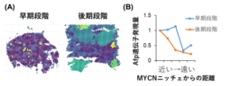 (B)肝がん腫瘍マーカーAfpの発現分布図。各空間スポット(円形領域)について、最も近いMYCNニッチェとの距離を算出し、その距離に応じて同心円状の領域に分類することで、MYCNニッチェを中心としたAfp発現の変化を定量的に評価した(近い→遠い)。後期段階ではAfp発現がMYCNニッチェの中心部に集中する傾向が見られ、早期段階で形成されたMYCNニッチェが、その後の腫瘍浸潤および拡大に影響することが示唆される。