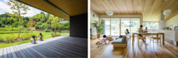 (右) 圧倒的な広さを感じる梁のない勾配天井。大開口の窓からたっぷりの緑と光が降り注ぎます