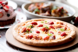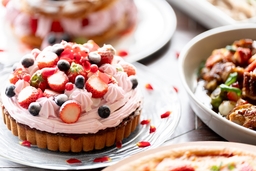 いちごを使用した創作メニュー「いちごと生ハムのピザ」は、いちごの甘酸っぱさと生ハムの塩味、とろけるチーズのコクが重なり合う逸品です。「いちごとバルサミコのチキンソテー」は爽やかないちごの風味とバルサミコソースがチキンの旨味を引き立てます。デザートには、断面も美しい「いちごミニフレジエタルト」をはじめ、和の甘味「いちご大福」、滑らかな口どけの「いちごティラミス」など、パティシエ特製のスイーツがブッフェ台を華やかに彩ります。