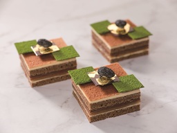 黒糖とほうじ茶のビスキュイに、胡麻の風味豊かなバタークリームと、滑らかな口どけのほうじ茶のガナッシュ、求肥、香ばしい胡麻のプラリネを重ね、京都産抹茶を吹き付けたチョコレートや金箔入りチョコレート、丹波産黒豆をトッピングした和素材のケーキです。素材が織りなす香りと、もっちりとした求肥の食感を一度に楽しめます。