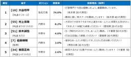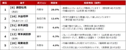 2位は大谷選手のロサンゼルス・ドジャースのチームメイトで、昨年のワールドシリーズMVPにも輝いた山本由伸選手、3位は前回大会を直前の故障により欠場したシカゴ・カブスの鈴木誠也選手、4位は昨年セ・リーグMVP受賞の阪神タイガースの佐藤輝明選手、5位は前回大会の優勝に圧巻の脚力で貢献した福岡ソフトバンクホークスの周東佑京選手でした。
