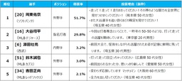 「知っている選手がいない」(1,616名)の回答者を除く、8,384名を対象に、「投手」「打撃」「走塁」「守備」「リーダーシップ」「盛り上げ役」の6部門で「勝利の鍵をにぎるキー選手」を選んでもらいました。各部門では1選手しか選ぶことができませんが、同一選手を複数部門で選ぶことは可能としました。各部門で「思い当たる選手がいない」を除く回答者を有効回答として得票率を算出しました。それぞれのトップ5を掲載します。