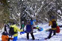 樹林帯にて水循環と植生を学ぶ パウダースノーを滑走する参加者