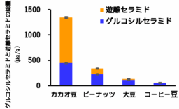 ③カカオ豆の種皮(カカオハスク)の総セラミド量を、世界で生産量の高い食用の豆であるピーナッツ、大豆、コーヒー豆の種皮と比較をしました。ピーナッツ、大豆、コーヒー豆の種皮と比べてもカカオ豆の種皮(カカオハスク)の総セラミド量(遊離セラミド+グルコシルセラミド総量)が最も多く、中でも遊離セラミドの総量が極めて多いことが示されました(図3)。この結果から、カカオハスクにおいてセラミド量、特に遊離セラミド量が多いのは、カカオ豆の種皮特有の性質であることが明らかになりました。カカオ豆は、赤道直下の国々で生産されるため、繁殖の早い病原菌からカカオ豆を守るためのバリアとして働いている可能性が示唆されます。