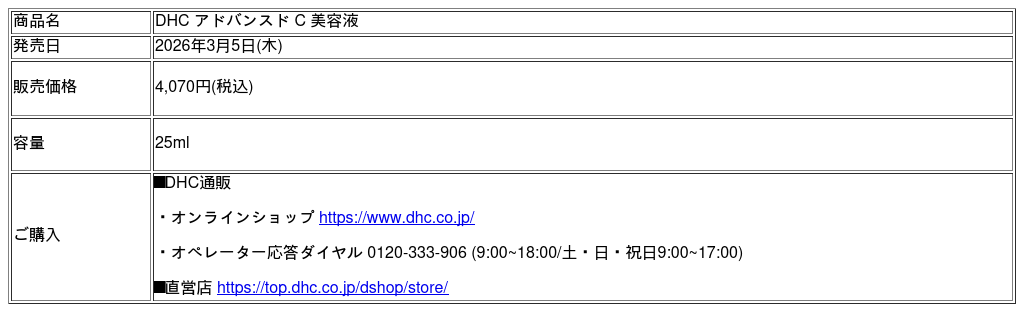 株式会社ディーエイチシー(本社:東京都港区、代表取締役社長:宮﨑 緑、以下:DHC)は、肌全体の透明感を損なう“にごり印象”やキメの乱れに着目して開発した美容液「DHC アドバンスド C 美容液」を2026年3月5日(木)より新発売いたします。
