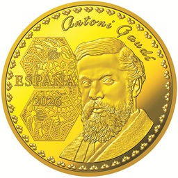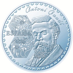 写真家ポー・オードゥアールが撮影した、アントニ・ガウディの最も有名な肖像を緻密な彫刻で刻印。左側には、ガウディが1904年にデザインし、カサ・バトリョやカサ・ミラの床、グラシア通りの歩道などに使われている代表的な意匠の一つである六角形のモザイクタイルを配置。コインの周囲には、グエル公園の入口にある建物の屋根をモチーフにしたモダニズム様式の装飾を刻印するなど、ガウディ建築の象徴的な美学を添えています。上部には「Antoni Gaudi」と刻印。