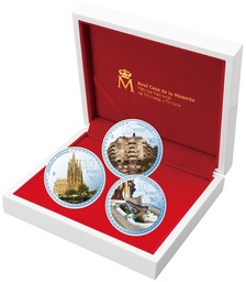 カラー銀貨は、<サグラダ・ファミリア>や、鮮やかなモザイクタイルと曲線美が織りなす幻想的な空間が広がる<グエル公園>、独創的な波打つような外観や錬鉄製バルコニーが特徴的な<カサ・ミラ>をモチーフとした3種類。直径40mmのコインに緻密な彫刻と色彩で表現されています。