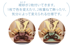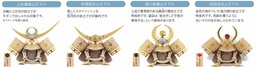 シャンパンゴールドの鍬形が特長的な上品な兜を使用しています。六角形の背板はマグネットで取り外し可能です。取り外すと唐草模様と龍の背景で雰囲気を変えて飾っていただけます。