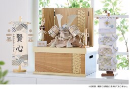 ナチュラルカラーと木目で統一した収納箱に青海波文様の格子を配した縁起が良い兜収納飾りです。