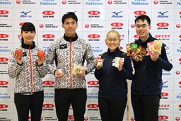全農は優勝チームへ副賞を贈呈するほか、出場選手の皆さんのハーフタイムや試合前後でのエネルギー補給用の飲食を提供します。3月2日(月)に行われた大会前記者会見の後に、選手を代表して前回優勝の「松村・谷田」、準優勝の「小穴・青木」に、提供する食材のパネルをお渡ししました。青森県産りんご「サンふじ」を全チームに1ケース(5キロ)ずつ提供したほか、大会期間中に選手エリアに設置する「もぐもぐブース」では、JAグループのプライベートブランド「エーコープマーク品」の「もちもちミルクパン」、全農の商品ブランド「ニッポンエール」の新商品「雫グミ 岡山県産清水白桃」を取り揃えました。