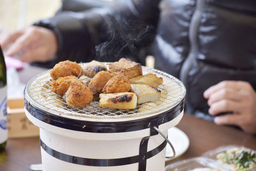 そこで、ASURAは昨年から、事前予約が可能な有料の休憩スペースを設け、仮設テントにテーブル・イスとお食事を温める七輪も設置しました。