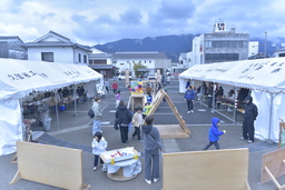 そこで、地域のイベントである「夜あそび大作戦」や「おひなさまめぐり」において、当日使われていなかった白壁交流広場をASURAが活用して、すべり台などの子供向けの遊具を設置し、万華鏡とゴムてっぽうの工作体験や簡単な軽食の販売をするなど、子どもたちが遊べる場や楽しめる場を企画し、イベントを更に盛り上げました。