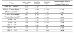 Table. Comparison of absolute sensitivities and volume-normalized sensitivities between the HED-IC and representative reference dosimeters. The values for volume-normalized sensitivity (nC mGy⁻¹ mm⁻³) allow direct comparison of detector response per unit sensitive volume. The volume-normalized sensitivity ratio is defined as the ratio of the volume-normalized sensitivity (sensitivity divided by active volume) of each detector to that of the Radcal 9015 (10X6-6M) ionization chamber, which is taken as unity. (Medical Physics掲載)