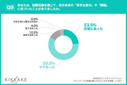 「Q9. あなたは、転職活動を通じて、自分自身の「苦手な部分」や「課題」に気づいたことがありましたか。」(n=327)と質問したところ、「非常にあった」が23.9%、「ややあった」が59.0%という回答となりました。