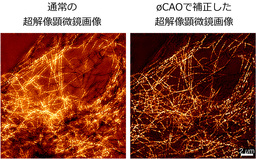 図2 細胞骨格の繊維の超解像顕微鏡画像の比較(通常とøCAOで補正)