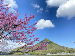 ダム湖に浮かぶ小さな島に咲く八重桜。水面に映る姿はまるで絵画のようで、特に朝の光に包まれる時間帯は格別です。春の締めくくりにふさわしい、静かな絶景です。