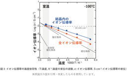 電気化学測定によって得られたパイロクロア型固体電解質の結晶内および焼結体全体のイオン伝導率の温度依存性を評価した結果を図3に示します。図3において、青のプロットは結晶内の、赤のプロットは焼結体全体のイオン伝導率を示しています。パイロクロア型固体電解質は、黒で示した従来の酸化物系・硫化物系・塩化物系それぞれの固体電解質と比べて、室温で同等以上の性能を示しています。さらに、パイロクロア型固体電解質は-100 ℃といった低温でもイオン伝導率の減少が抑えられていることが確認されました。このことから、パイロクロア型固体電解質を全固体電池に応用すると、低温特性に優れることから極地や宇宙空間などの極低温環境の用途でも高い性能を発揮できると期待されます。