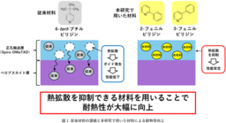 これらの材料探索の結果、耐熱性向上にはピリジン環の置換基の位置が重要な因子であることが明らかとなりました。特に、ピリジンの窒素(N)原子に対して置換基であるフェニル基が60度(図3黄色枠左)または120度(図3黄色枠右)の位置にある場合に高い耐久性を示すことが分かり、耐熱性を向上させるための分子構造の設計指針を得ることに成功しました。