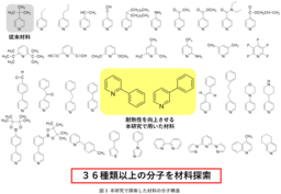 耐熱性を有する材料を探索するため、分子構造の異なる材料の検証を行いました。まず、分子構造が異なる36種類の分子を選定し、各分子がペロブスカイト太陽電池の耐熱性に与える影響を評価しました(図3)。多様な物理物性を有する分子を網羅的に選定することで、どの物理パラメーターがペロブスカイト太陽電池の耐熱性に寄与するかを解析しました。評価した物理物性としては、分子の歪み具合、沸点、溶解性、分子量、ガラス転移温度などが挙げられます。ここでの分子の歪み具合とは、窒素(N)原子の位置に対して、置換基が何度の角度に位置するかを意味します。