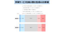 家庭学習における生成AIの利用についての評価を聞いたところ、「できるだけ利用を増やしたい」が5.5%、「現在より少し利用の場面を増やしたい」が23.7%と、合わせて29.2%となり、昨年より4.4ポイント増加する結果となりました。「まったく利用したくない」は21.2%、「現在より少し利用の場面を減らしたい」は7.7%と、合わせて28.9%となり、昨年より7.9ポイント増加する結果となりました。