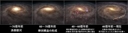 研究グループは、この大移動の引き金として、棒状構造の形成期に注目しました。形成後の安定した棒状構造は共回転バリアにより大移動を難しくします。逆に、形成時期には、その力学的影響によって中心部で星形成が活発化し、同時に星が効率的に動径方向移動できる可能性が先行研究で指摘されています。もし、天の川銀河の棒状構造が約60~70億年前に形成されたとするなら、その形成に伴い、約40~60億年前に太陽系と多数の太陽双子星が銀河の中心側で誕生し、誕生後まもなく現在の位置まで大移動できた可能性があります(図1;図4下)。棒状構造の形成時期は長年議論され、80億年以上前とする説が主流でした。しかし本研究のシナリオは、その時期が約60~70億年前であった可能性を新たに指摘する点でも意義があります。