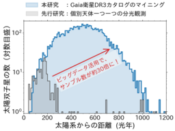 東京都立大学の谷口大輔助教と国立天文台の辻本拓司助教を中心とする研究グループは、Gaia衛星[2]が公開した大規模な天体サンプルGSP-Spec[3]を用いて、太陽と非常に似た性質を持つ「太陽双子星[1]」6,594天体の高信頼度カタログを構築しました。これは従来の最大規模カタログの約30倍に相当する天体数です。さらに、この世界最大カタログから観測の偏り(選択効果[4])を統計的に補正した結果、太陽系の近傍に、太陽系の誕生時期(46億年前)を含む約40~60億年前に生まれた太陽双子星が数多く存在することを発見しました。