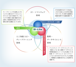 デジタルリテラシー協議会が定義するDi-Liteは、すべてのビジネスパーソンに共通して求められるデジタルリテラシーの範囲を示す考え方です。現在、「ITソフトウェア領域」「数理・データサイエンス領域」「AI・ディープラーニング領域」の3領域で構成されており、学習範囲の参考として「ITパスポート試験」「データサイエンティスト検定TM」「G検定」のシラバスが推奨されています。