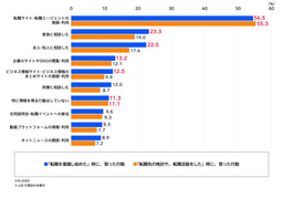 ・必要な情報を得るためにどのような行動をしたかについて、「転職サイト・転職エージェントの登録・利用」をした人は、「転職を意識し始めた」時は54.5%、「転職先の検討や、転職活動をした」時は55.3%と、いずれも半数を超える。「転職を意識し始めた」時は、「家族に相談した」(23.3%)、「友人・知人に相談した」(22.5%)割合が、「企業のサイトやSNSの閲覧・利用」(13.2%)、「ビジネス情報サイト・ビジネス情報のまとめサイトの登録・利用」(12.5%)よりも高い傾向にある。また、「特に情報を得る行動はしていない」人は、いずれの段階でも約1割。【図表1】