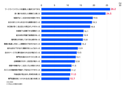・転職先選定のポイントとして、「ワークライフバランスを重視した働き方ができた」(26.2%)や「長く働ける安定した環境だと感じた」(24.5%)など、働き方や生活の安定性に関する項目が上位に。一方で、「専門知識を身につけられる点に魅力を感じた」(10.7%)、「今後成長が見込まれ、将来性を感じた」(11.0%)などの項目は低い傾向にある。【図表2】