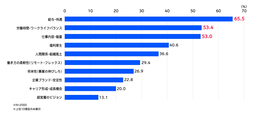 ・転職先の検討にあたり、最も重視される点は「給与・待遇」(65.5%)となり、「労働時間・ワークライフバランス」(53.4%)、「仕事内容・裁量」(53.0%)が続く。【図表5】