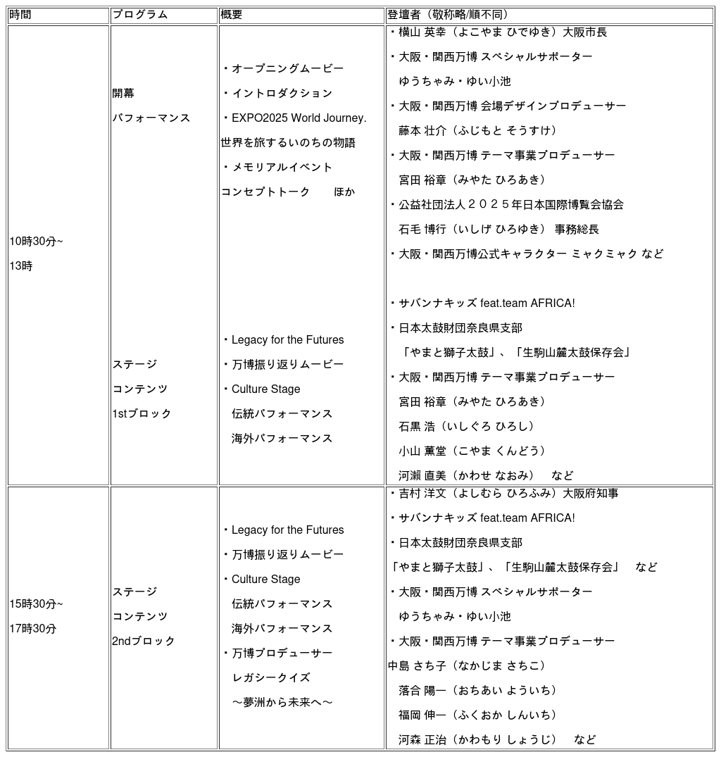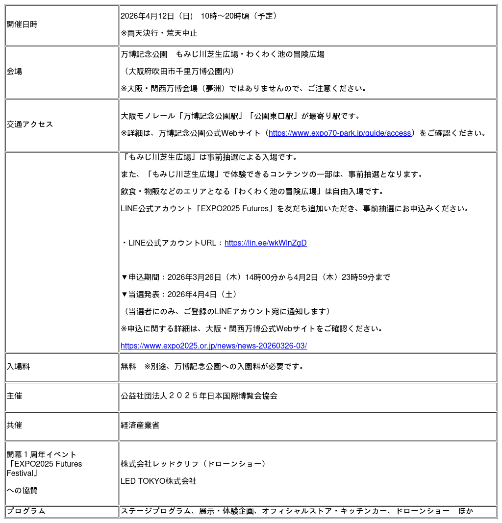 第一弾「開幕1周年イベント」として、2026年4月12日(日)に、「EXPO2025 Futures Festival」をメイン会場となる万博記念公園内特別会場で開催するとともに、2026年4月8日(水)から4月14日(火)の7日間、「EXPO2025 Futures Station」を、サテライト会場となる大阪メトロ中央線夢洲駅地上で開催しますので、下記の通りお知らせします。