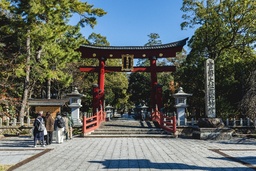 北陸道総鎮守。朱の大鳥居が往来の歴史を象徴する。