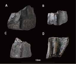 久慈層群玉川層から産出したイグアノドン類の歯化石。A、KAM201; B、OSD7162; C、OSD6230; D、OSD2117。A,B,C、外側観; D、内側観