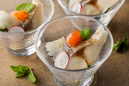 西洋ハーブを配合した独自の飼料で育成された「ハーブ鯖」は、特有の臭いもなく、さらっとした脂と甘く旨味あふれる味わいが広がります。そんなハーブ鯖を、幻の柑橘「ゆうこう」のさっぱりとした酸味と上品な香りを加えたドレッシングでお召し上がりいただきます。