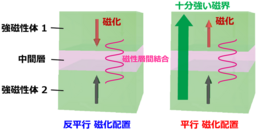 二つの強磁性体(金属磁石)薄膜の間に、磁性を持たない中間層(非磁性体薄膜)をナノメートルスケールの厚さで挟んだ時(下図)、二つの強磁性体のもつ自発磁化が同じ方向にそろう相互作用が働くか、逆方向になる相互作用が働くかが中間層の膜厚に応じて変化する現象が生じる。これは量子効果で、「磁性層間結合」と呼ばれる。この仕組みを使うと、人工的に二つの強磁性体の磁化配置が逆向きになる構造である「人工反強磁性体」を作ることができる。この人工反強磁性体にかける磁界を少しずつ強くしていくと、二つの強磁性体の磁化の向きが逆向きから同じ向きに切り替わる。この時の磁界の強さを交換結合磁界という。これは、人工反強磁性体における磁性層間結合の強さを示す指標となる。