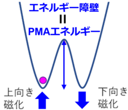強磁性体(磁石)中では、磁化が向きやすい方向と向きにくい方向がある。これを「磁気異方性」という。特に、薄膜の膜面垂直方向に磁化が向きやすい異方性を「垂直磁気異方性(PMA)」と呼ぶ。ゼロ磁界下で垂直磁化をもつ強磁性体薄膜の磁化状態はエネルギー的に下図のような形で記述され、磁化反転を起こすためには、エネルギー障壁に相当する垂直磁気異方性エネルギーを超える必要がある。垂直磁気異方性により優れた記憶保持性能が得られ、また記憶層の体積を小さくできることから、ハードディスクやMRAMの大容量化に利用されている。