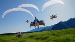 松山ケンイチさんが浮遊するソファーで自由に空を舞う!