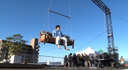 ソファーごと浮き上がるシーンは、専門家の指導の下、安全性に十分配慮しながら、大掛かりな仕掛けを用いて撮影が行われました。屋上テラスでの撮影では、ハーネスを着用した松山さんをワイヤーでトラス(仕掛けや人物などを固定するために使用する金属製の構造物)に固定。ソファーも別のワイヤーでトラスに固定し、滑車などを使いながら、スタッフ数人がかりでつり上げるという手法で撮影しました。本番前、「(浮上中は)何もしゃべらなくていいですよね」と尋ねた松山さんに対して、監督は「できれば、ちょっとしたニュアンスがほしいです」と回答。それを受けて、「おぉ~!」「どこへ行くのかな?」とアドリブを入れた松山さんは、「あははは、なんだこの絵(笑)」「面白いなぁ」と楽しそうに笑いながら、ご自身のプレイバック映像を確認していました。