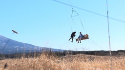 草原を飛んでいるシーンは高原に移動して、クレーン車2台で作ったワイヤー動線に4点で固定したソファーをつり上げ、同じ動線上に松山さんをつるす仕掛けを使って収録しました。ここでは、カメラマンも同様の仕掛けでつるされたまま撮影をし、より臨場感のある映像を追求することに。本番直前、ハーネスを装着してカメラを持っているカメラマンを見た瞬間、松山さんは思わず「え、浮くんですか?」「マジっすか!?」と目を丸くしていました。