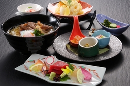 先付三種/お造里/季節の天ぷら/黒毛和牛稲庭うどん/香の物/水菓子
