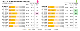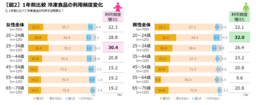 冷凍食品の利用頻度が1年前と比べてどう変化したかを聞くと、「変わらない」(女性65.7%、男性67.3%)が多い中、女性の22.3%、男性の22.1%は利用頻度が「増えた」と答えています。性年代別に見ると、割合が高いのは女性25〜34歳が30.4%、男性20〜24歳が32.0%と若い年齢の利用頻度が増えています[図2]。