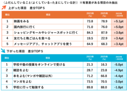 小中学生が〈ふだんしていること〉2023年から2025年で旅行やレジャー等“お出かけ”が増加、“読む”が減少