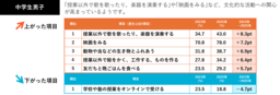 一方、スコアが下がった項目の差分上位を見ると、「学校や塾の授業をオンラインで受ける(-5.0pt)」が1位となったほか、「雑誌をよむ(-4.9pt)」「本をよむ(マンガや雑誌以外)(-4.4pt)」「マンガをよむ(-3.0pt)」と、“読む”関連の項目のスコアが軒並み下がる結果となりました。