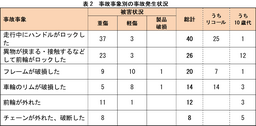自転車の事故 299 件のうち、事故発生時の状況が判明したものについて、件数の多い主な事故事象を表 2 に示します。