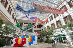 館内1階モール広場では、高さ20mの吹き抜け空間を活用した最大10m、総数41流の鯉のぼり展示がスタートしました。本展示は、ホテルスタッフが約4日間をかけて設営し、一つひとつ高さや角度を細かく調整することで、空中を泳ぐような立体的な演出を実現しています。本来は屋外で楽しむ季節行事を屋内で体験できる点が特徴であり、天候や混雑に左右されず間近で鑑賞できる“逆説的な体験価値”を創出しています。地域から寄贈された鯉のぼりを活用することで、地域文化の継承と再活用にもつながる展示として展開しています。