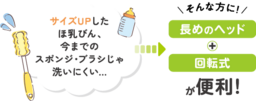 本商品は、サイズアップしたほ乳びんでもすみずみまでムラなく洗浄でき、届きにくい部分の汚れも効果的に落とすことができる、回転式のスポンジブラシです。