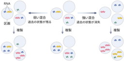 一方で、従来の理論では、区画の内容が完全に混ざると仮定した単純化がしばしば用いられてきましたが、部分的な混合が起こる状況や、過去の分子組成がどの程度引き継がれるかという点が分子系に与える影響は十分に理解されていませんでした。